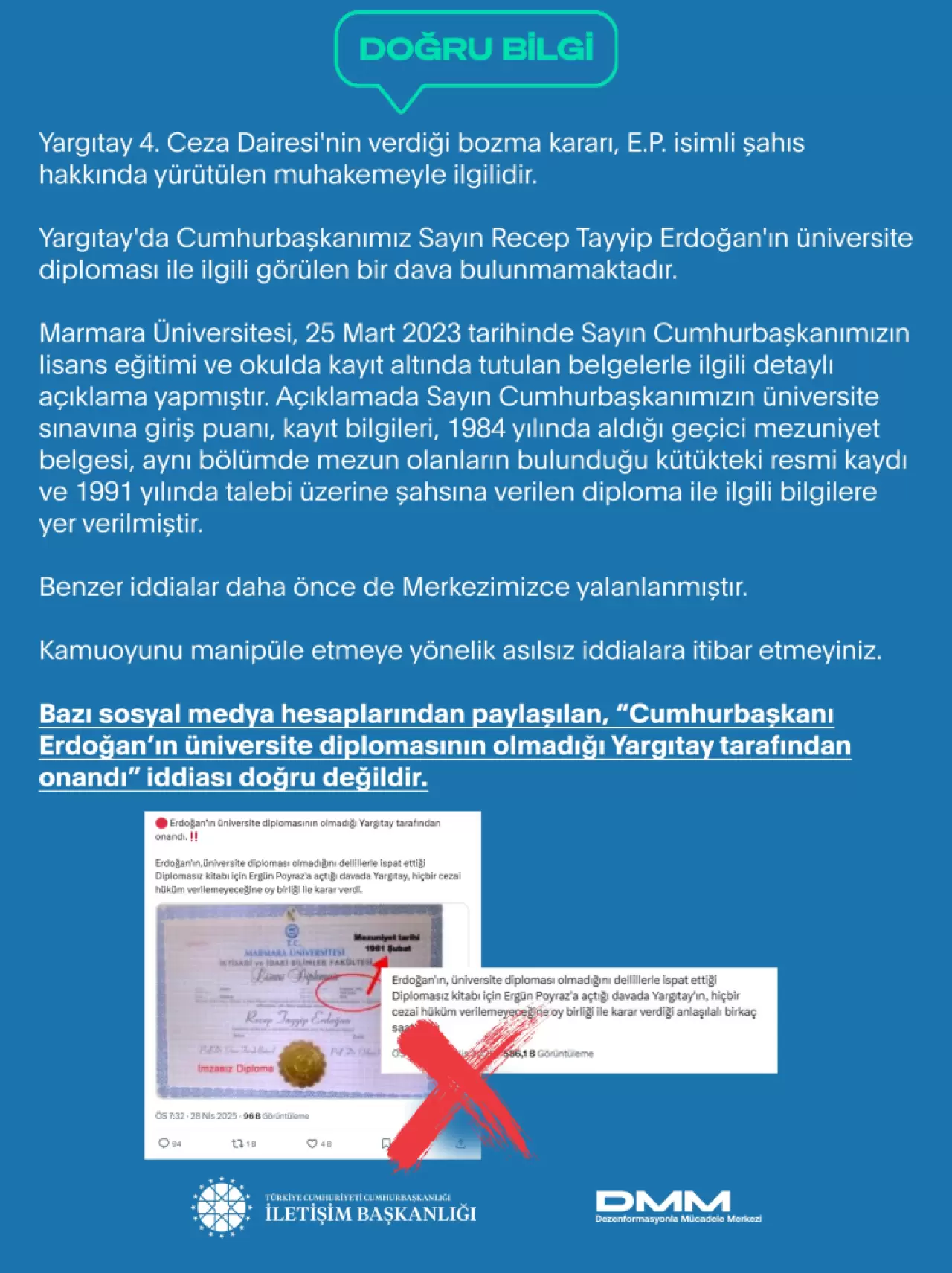 DMM'nin sosyal medya hesabından yapılan açıklamada, "Bazı sosyal medya hesaplarından paylaşılan, 'Cumhurbaşkanı Erdoğan'ın üniversite diplomasının olmadığı, Yargıtay tarafından onandı' iddiası doğru değildir. Yargıtay 4'üncü Ceza Dairesi'nin verdiği bozma kararı, E.P. isimli şahıs hakkında yürütülen muhakemeyle ilgilidir. Yargıtay'da Cumhurbaşkanımız Sayın Recep Tayyip Erdoğan'ın üniversite diploması ile ilgili görülen bir dava bulunmamaktadır. Marmara Üniversitesi, 25 Mart 2023 tarihinde Sayın Cumhurbaşkanımızın lisans eğitimi ve okulda kayıt altında tutulan belgelerle ilgili detaylı açıklama yapmıştır" denildi.