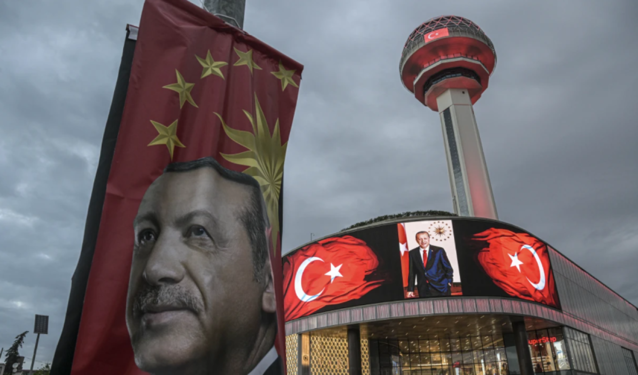Atakule'nin giriş kapısının üst kısmında yer alan ekranlarda ise Erdoğan'ın Cumhurbaşkanlığı forsu önünde çekilmiş fotoğrafı ile Türk bayrakları yer aldı.