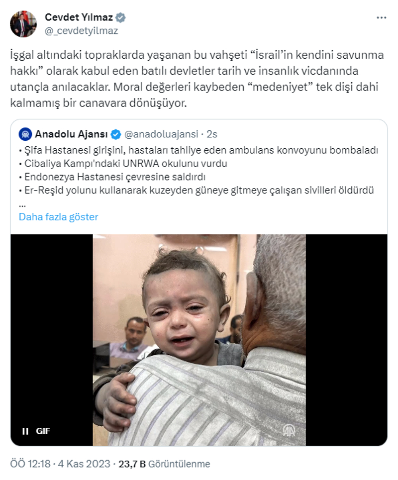 Yılmaz, sosyal medya hesabından, Anadolu Ajansının İsrail'in Gazze Şeridi'ne saldırılarına ilişkin haberini alıntılayarak, şunları kaydetti: