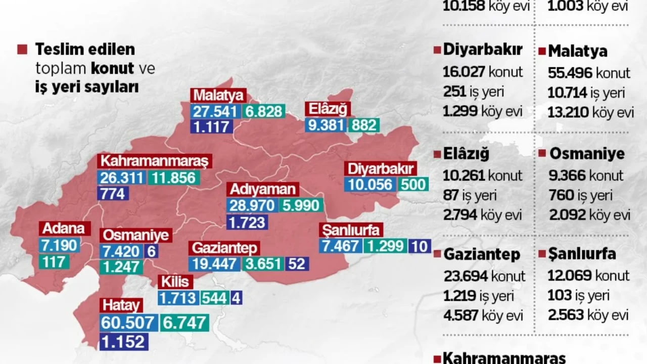 Cumhurbaşkanlığı İletişim Başkanlığının NSosyal hesabından Kahramanmaraş merkezli 6 Şubat 2023'teki depremlerin ardından 11 ilde başlatılan inşa seferberliğine ilişkin paylaşımda bulunuldu. Asrın inşa seferberliğiyle deprem bölgesinde kalıcı konutların yapımının tüm hızıyla sürdüğü belirtilen paylaşımda, il il teslim edilen konut, iş yeri ve köy evlerinin sayılarının bulunduğu infografiğe de yer verildi.