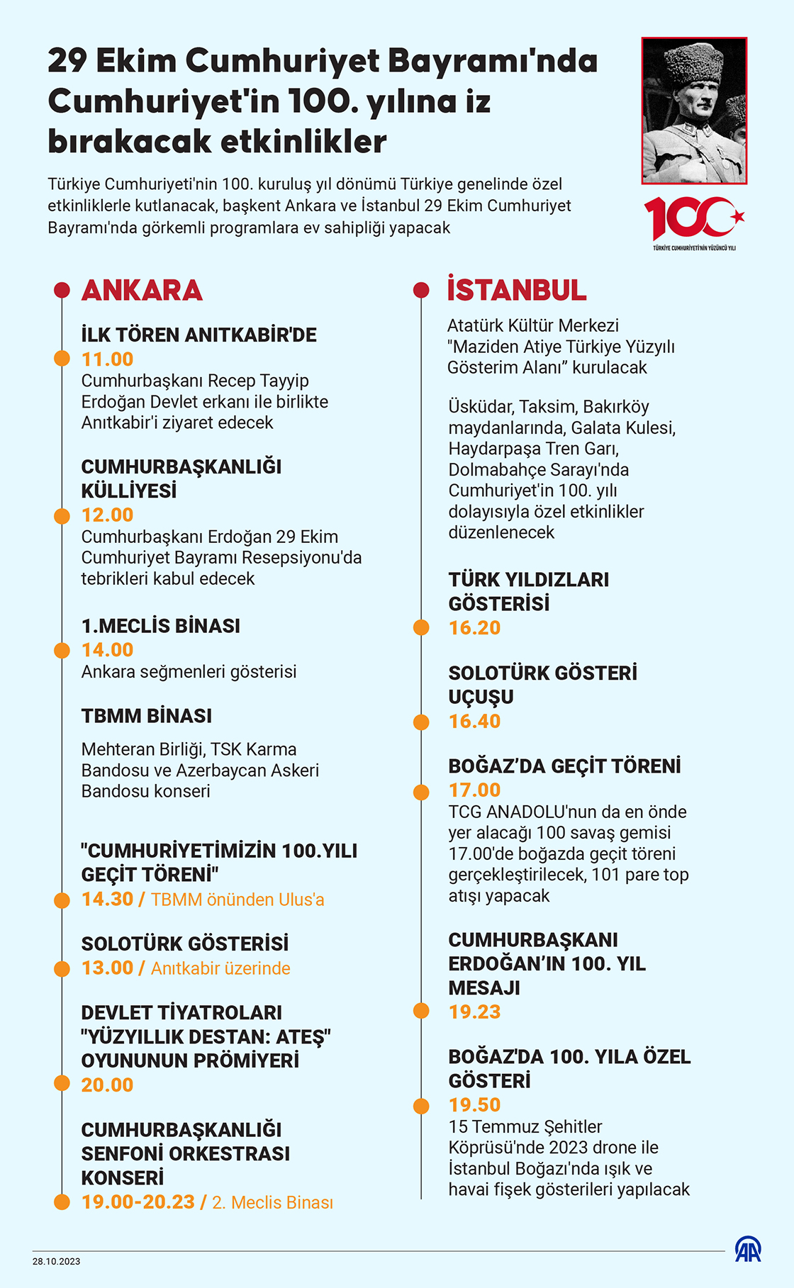 Türkiye Cumhuriyeti'nin 100. kuruluş yıl dönümü dolayısıyla Cumhurbaşkanı Recep Tayyip Erdoğan başkanlığındaki devlet erkanı, Anıtkabir'i ziyaret ederek Atatürk'ün mozolesine çelenk koyacak.