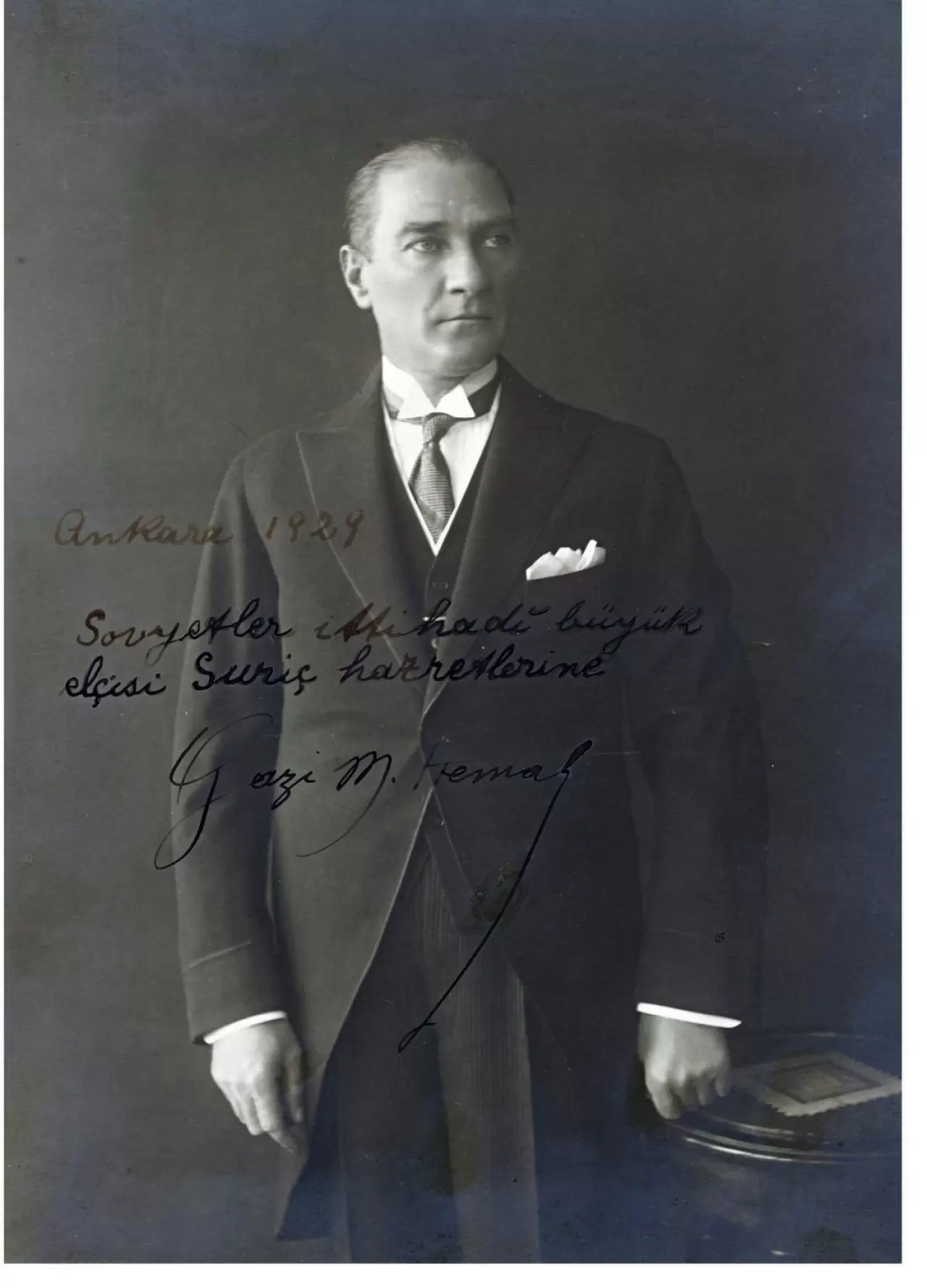 Örnek olarak Atatürk'ün bu fotoğraflarından 1 tanesi Temmuz 1927'de Servet-i Fünun dergisinde kapak olmuştur. Sovyet Büyükelçisi Suriç’e imzaladığı biliniyor. Bir diğer örnek ise Atatürk bu fotoğrafını Eylül 1927'de en yakın arkadaşlarından Nuri Conker Bey'e imzalıyor, bir koleksiyonerde bulunuyor, onu şans eseri gördüm" diye konuştu.