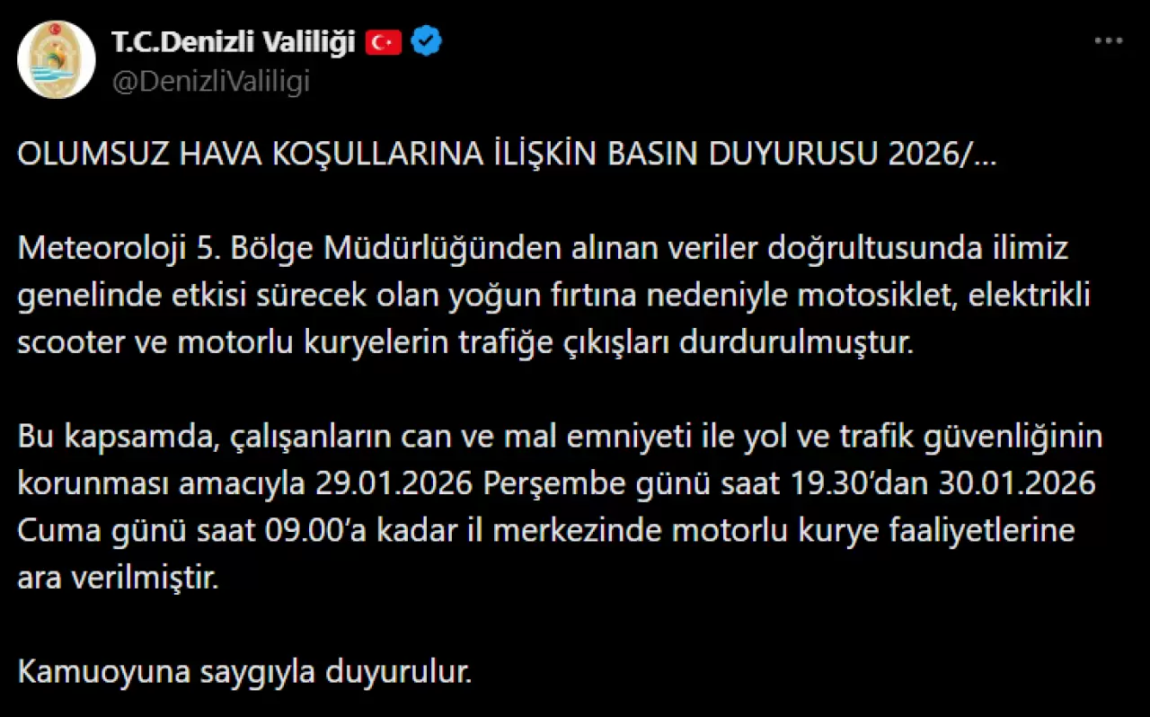 Meteoroloji 5. Bölge Müdürlüğünden alınan veriler doğrultusunda il genelinde etkili olması beklenen yoğun fırtına nedeniyle, can ve mal güvenliğinin sağlanması amacıyla motorlu kurye faaliyetlerine ara verildi. Denizli Valiliği tarafından yapılan yazılı açıklamada, motosiklet, elektrikli scooter ve motorlu kuryelerin il merkezinde trafiğe çıkışları 29 Ocak 2026 Perşembe günü saat 19.30’dan, 30 Ocak 2026 Cuma günü saat 09.00’a kadar durdurulduğu ifade edildi.