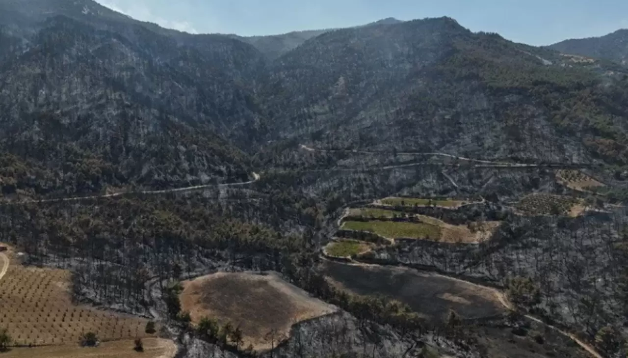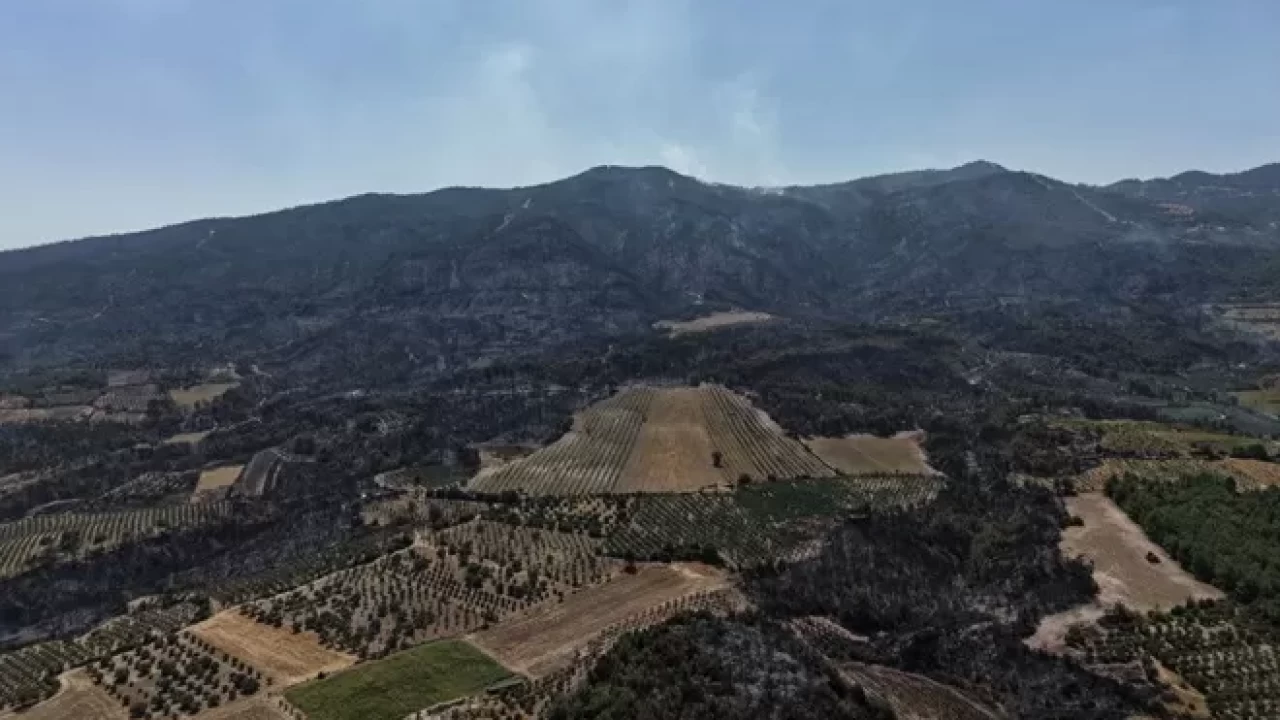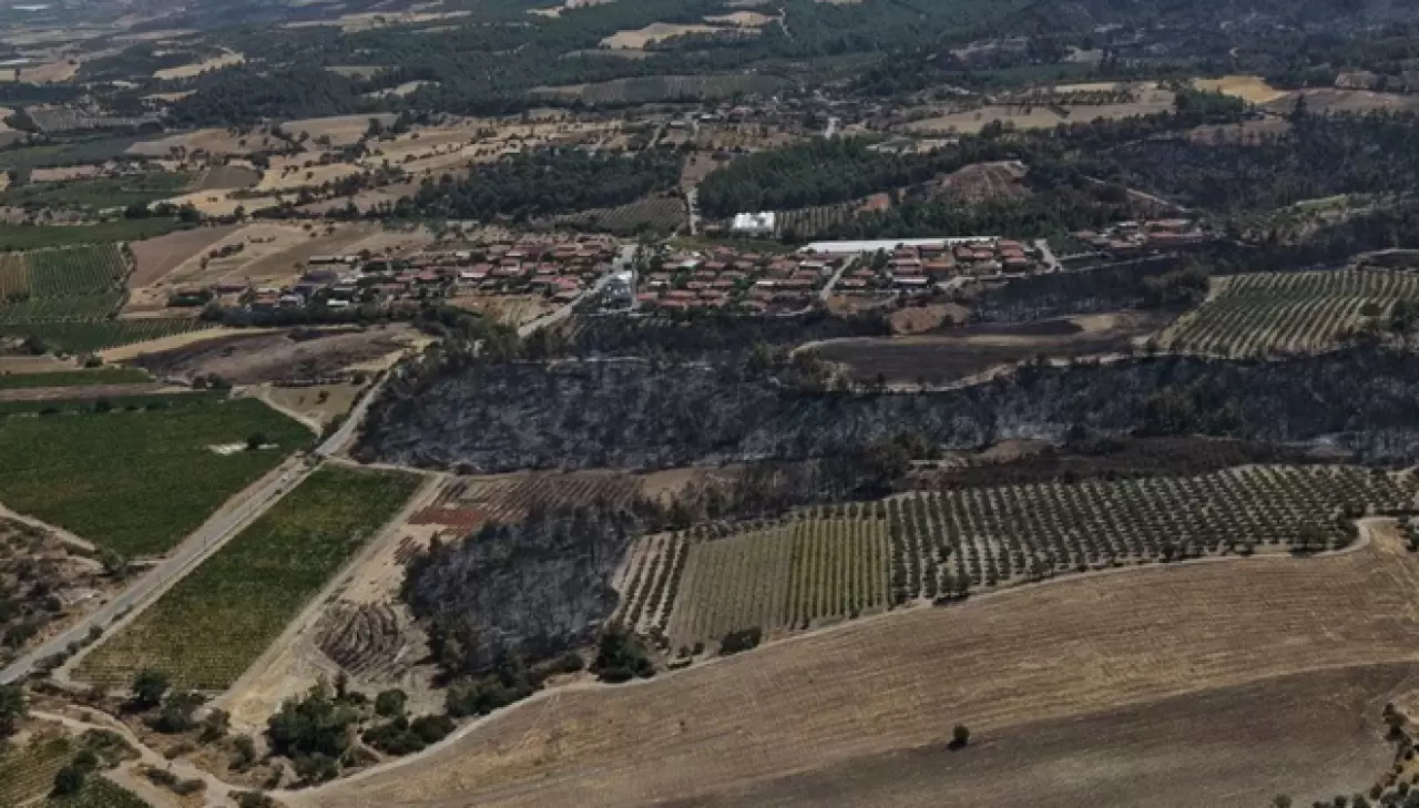 Soğutma çalışması yapılan bölgeler ile Bölmekaya Mahallesi'nde hasar alan araziler ve yerleşim yerleri havadan görüntülendi.