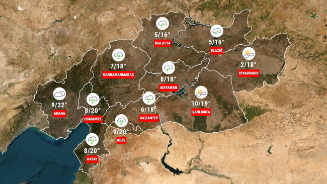 Hatay'da ise hava sıcaklıklarının bugün en düşük 8, en yüksek 20 derece olması bekleniyor. Öğle saatlerinden sonra sağanak bekleniyor.