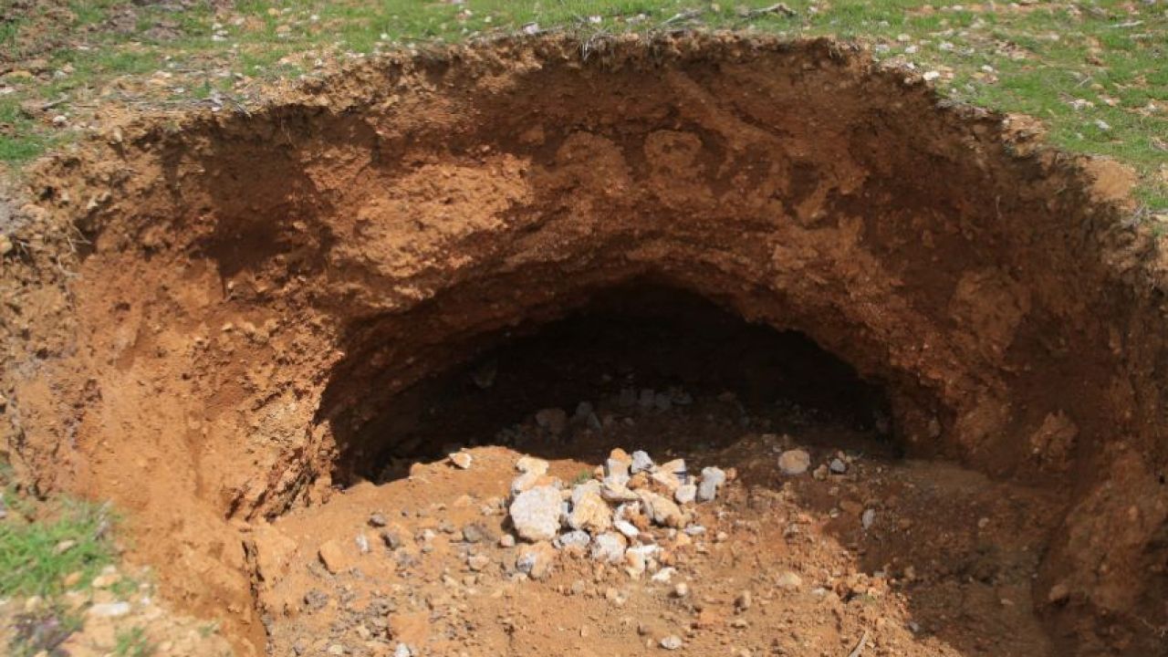 Yaklaşık 4 metre genişliğindeki obruk, dron ile görüntülendi.