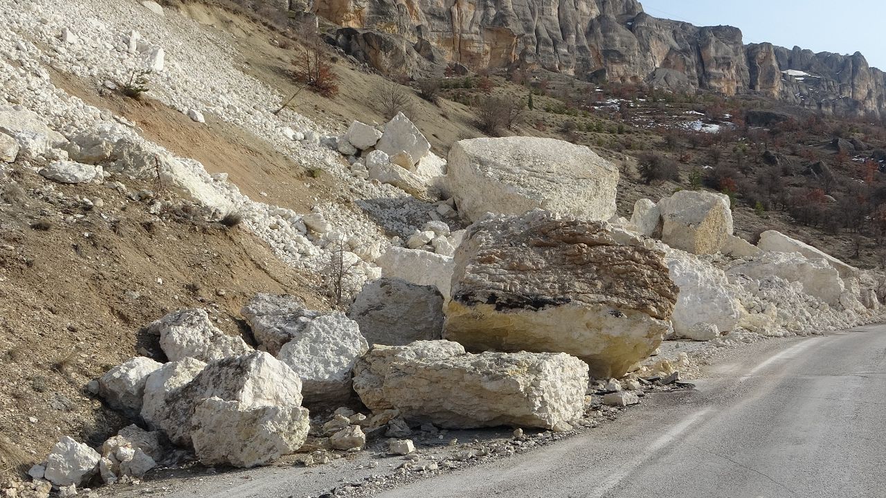 Kahramanmaraş merkezli depremlerde etkilenen Malatya’nın Akçadağ ilçesinde dağlardan kopan dev kaya parçaları yollara savruldu.
