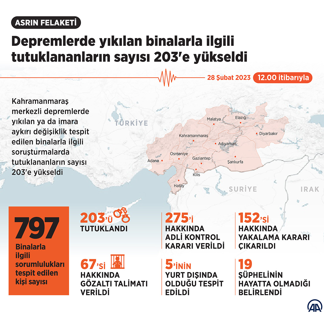 6 Şubat'taki Kahramanmaraş merkezli depremlerde yıkılan ya da imara aykırı değişiklik tespit edilen binalarla ilgili başsavcılıklarca resen başlatılan soruşturmalarda 797 zanlının sorumluluğu saptandı.
