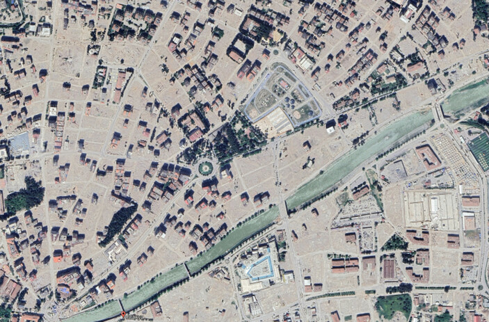 Depremin öncesi ve sonrasında uygu görüntülerine bakıldığında enkazın büyüklüğü görülebiliyor.