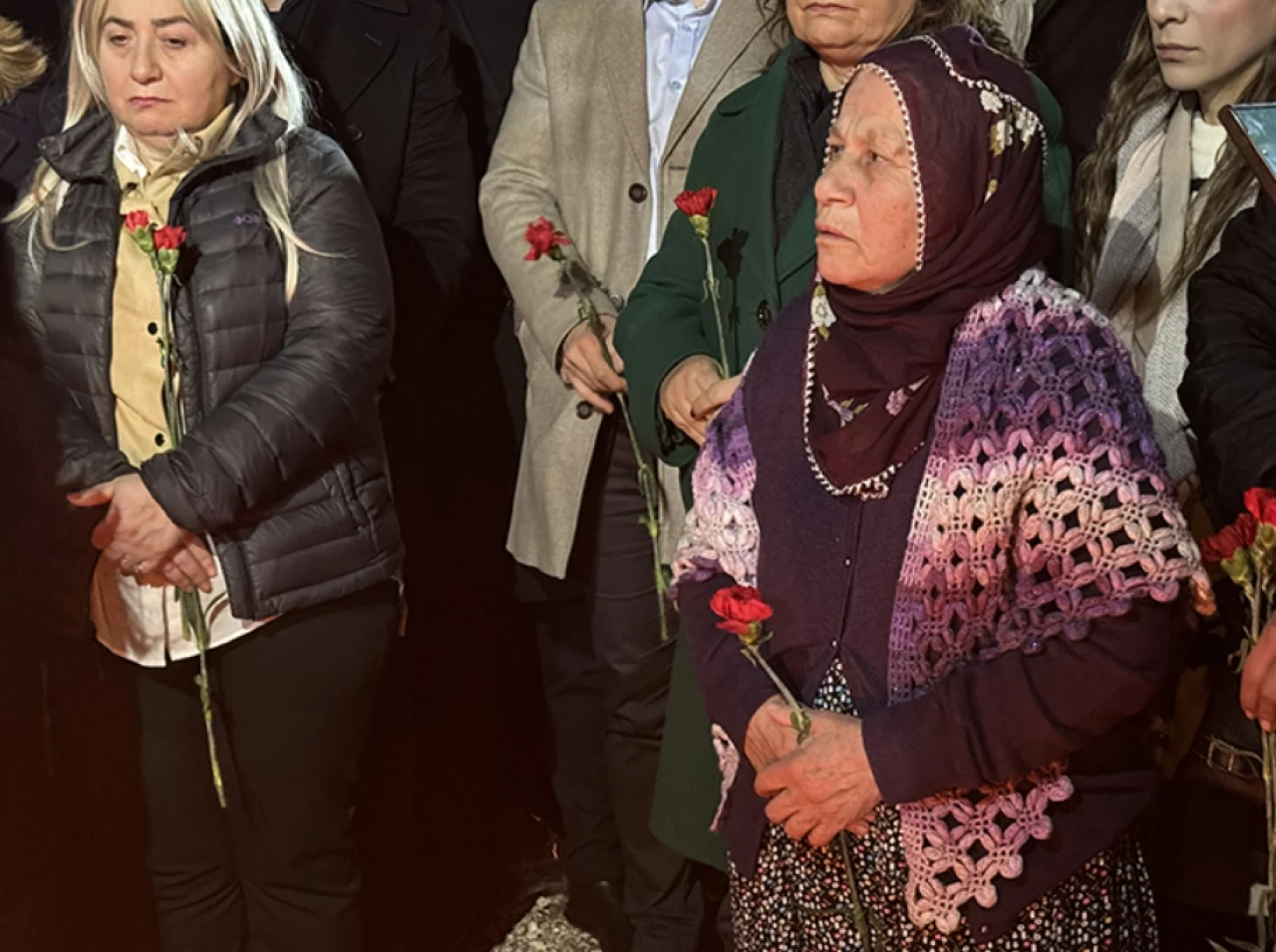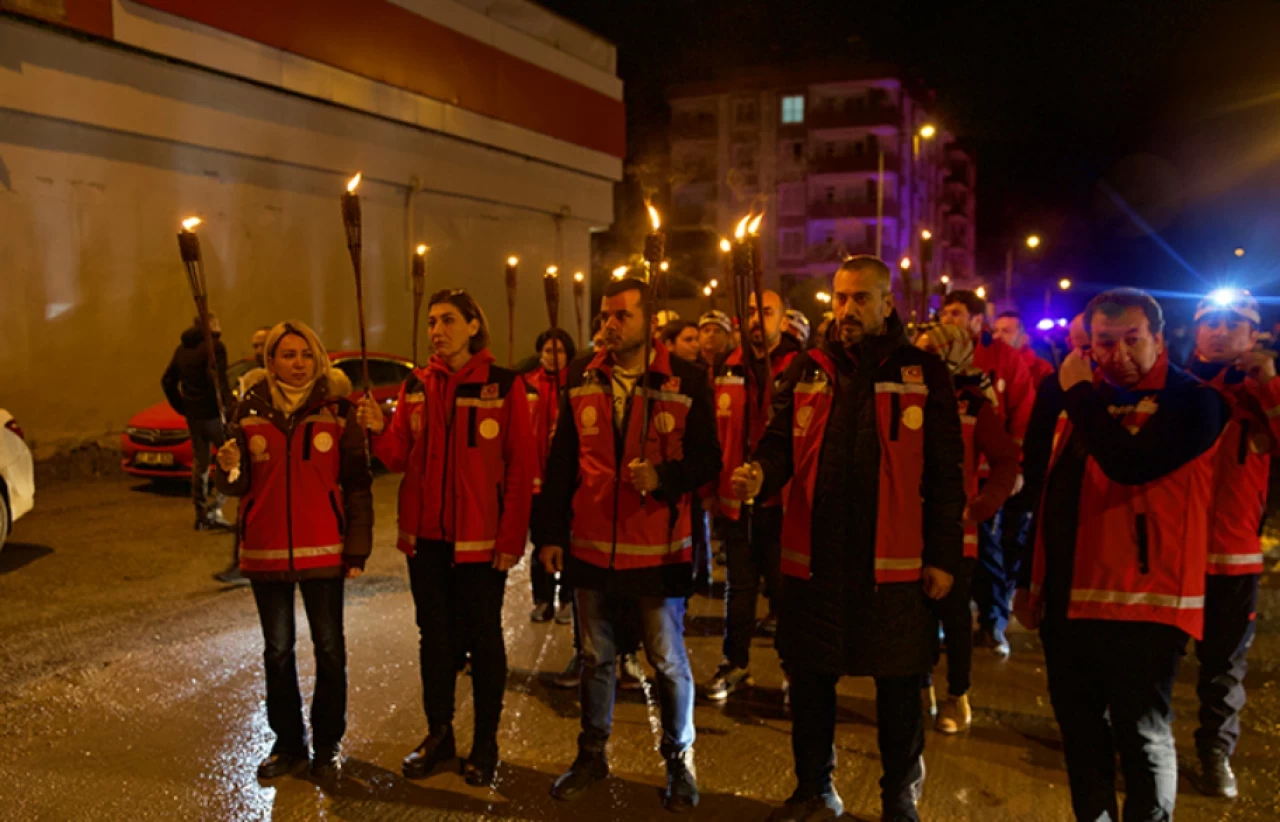"Asrın felaketi"nde 17 kişinin hayatını kaybettiği Hayat Sitesi alanında buluşan bir grup, meşale yakarak alana karanfil bıraktı, saygı duruşunda bulundu.