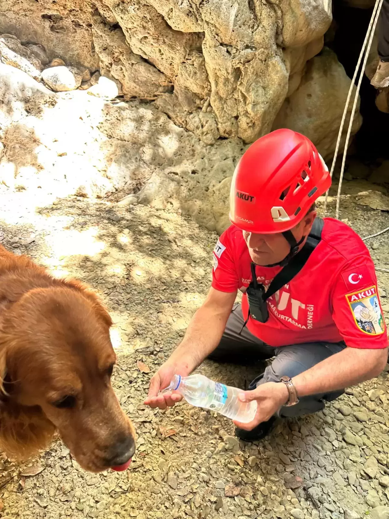 Golden Retriever cinsi, 12 yaşındaki 'Ateş' isimli köpek, 2 gün önce sarp arazideki dere yatağında mahsur kaldı. Köpeği fark eden köylüler, kendi çabalarıyla bulunduğu yerden çıkaramayınca durumu AKUT Fethiye ekibine bildirdi.