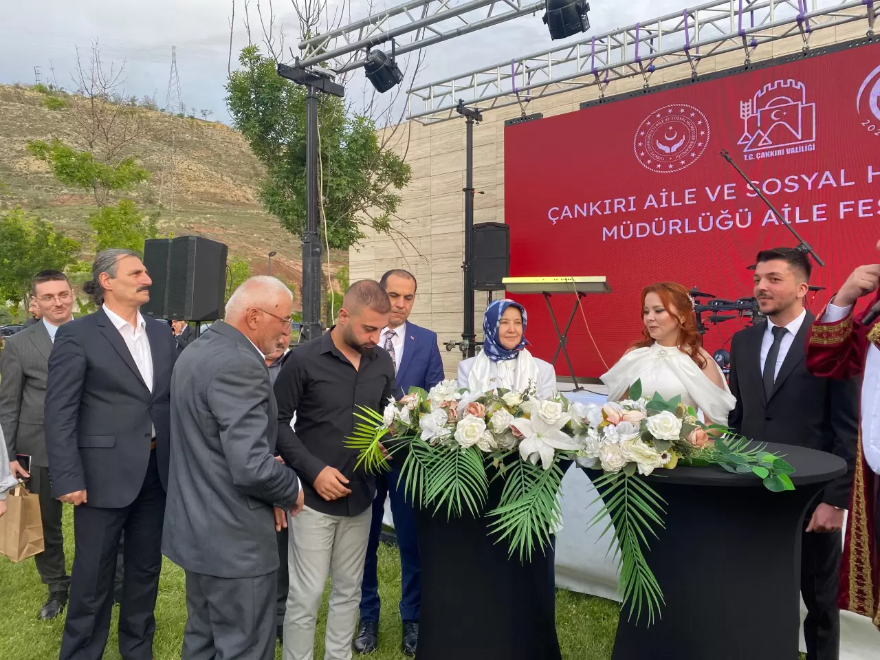 Çankırı'da, Recep Tayyip Erdoğan Parkı'nda düzenlenen nikah törenine katılan Aile ve Sosyal Hizmetler Bakan Yardımcısı Leman Yenigün, Kadriye ve Göktuğ Akçakaya çiftinin mutluluğuna ortak oldu. Bakan Yardımcısı Yenigün, devletin evlilik desteği sağladığı genç çiftin nikah şahidi oldu.