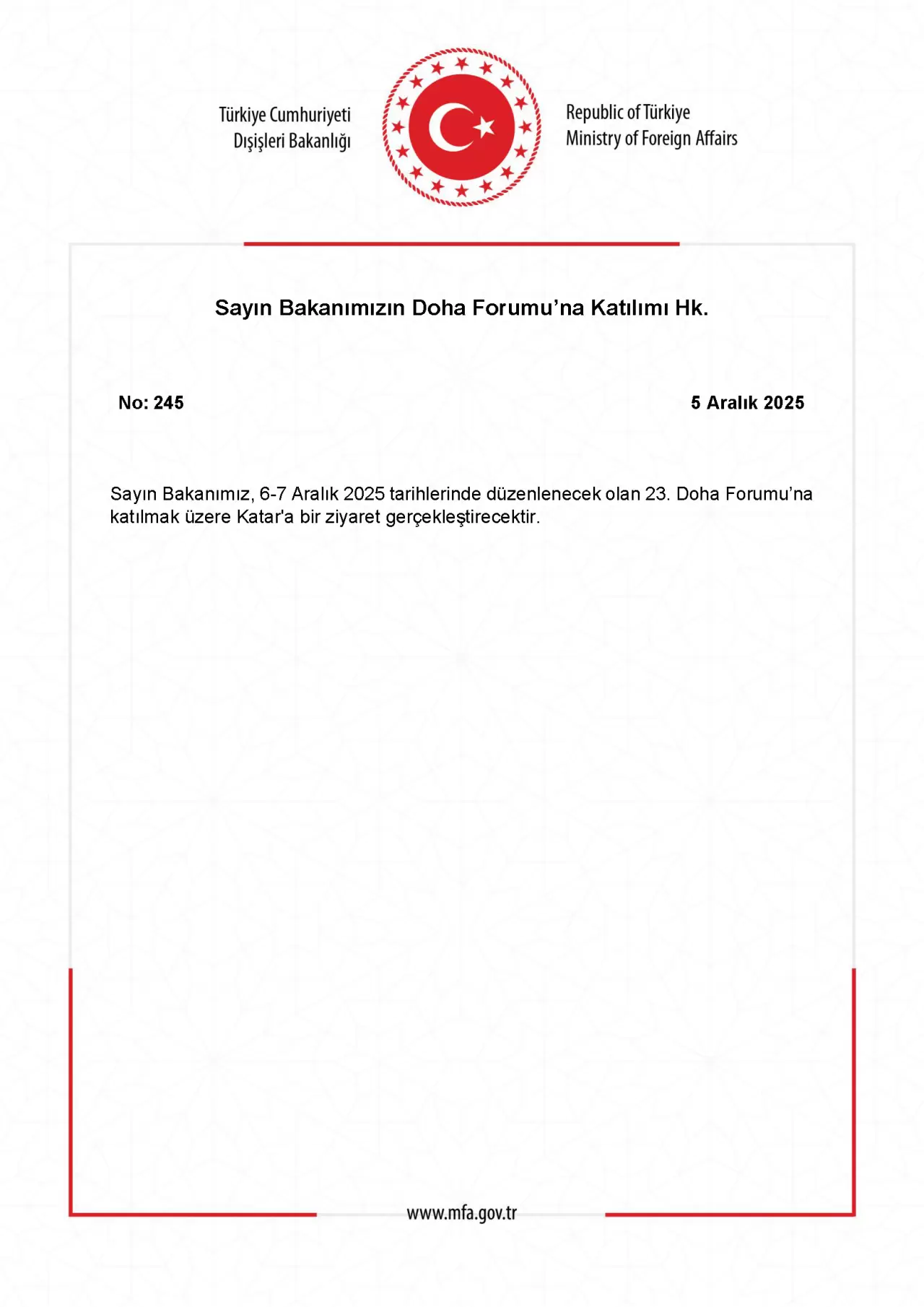 Sayın Bakanımız, 6-7 Aralık 2025 tarihlerinde düzenlenecek olan 23. Doha Forumu'na katılmak üzere Katar'a bir ziyaret gerçekleştirecektir.