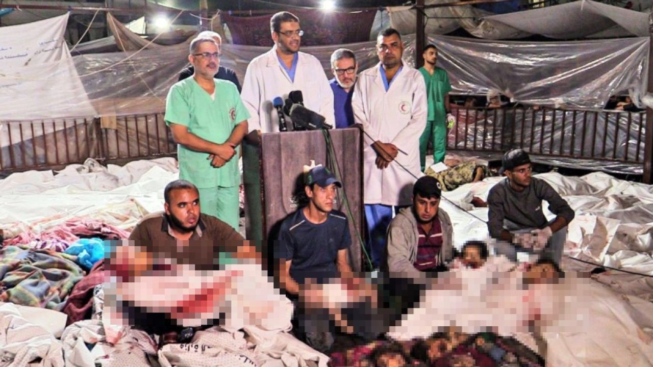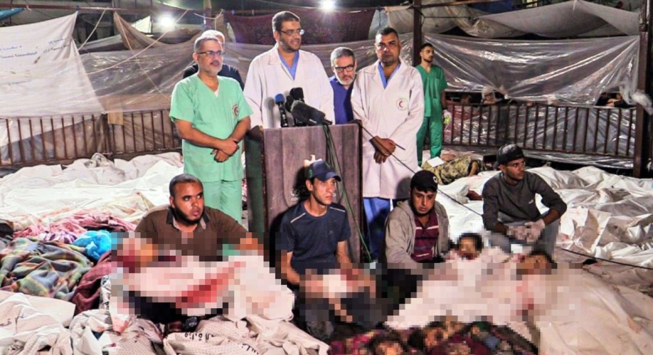 Paylaşımda İsrail'in Gazze'ye saldırılarında hayatını kaybeden çocuklar, kefenlenmiş cenazeleri taşıyan Gazzeliler ve toplu mezar görselleri yer alıyor.