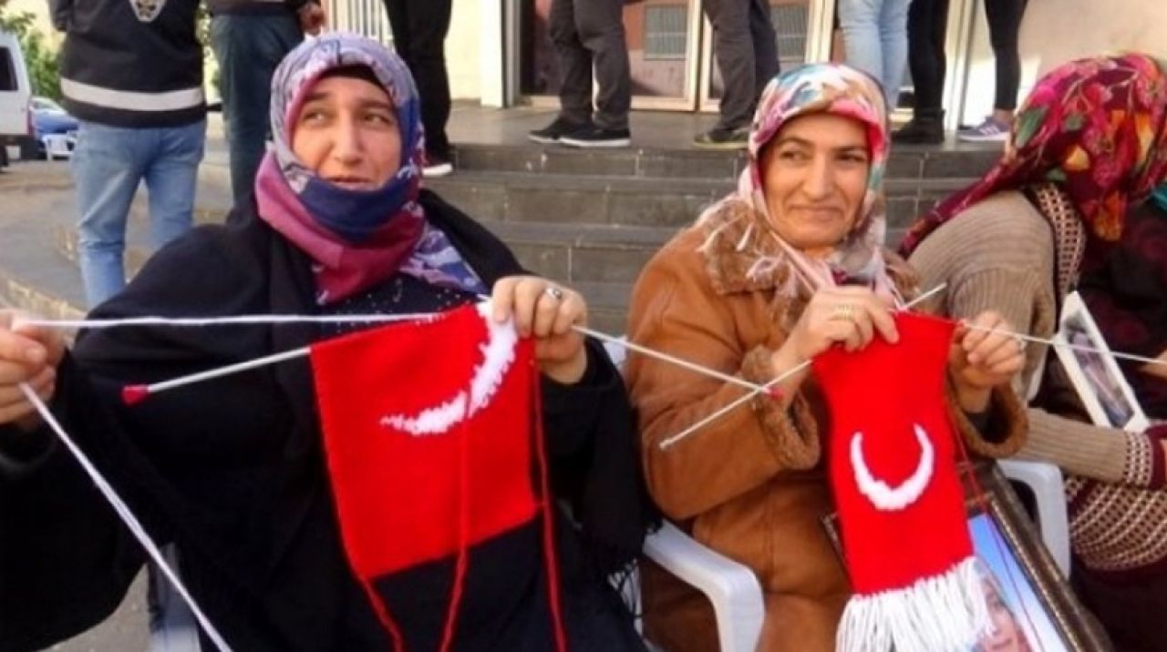Diyarbakır'da 65 gündür HDP il binası önünde oturma eylemi yapan ailelerin bekleyişi devam ediyor. Anneler bir taraftan çocuklarını beklerken diğer tarafta da Cumhurbaşkanı Recep Tayyip Erdoğan ile MHP lideri Devlet Bahçeli'ye üzerinde ay yıldız işlemeli atkı örüyor.