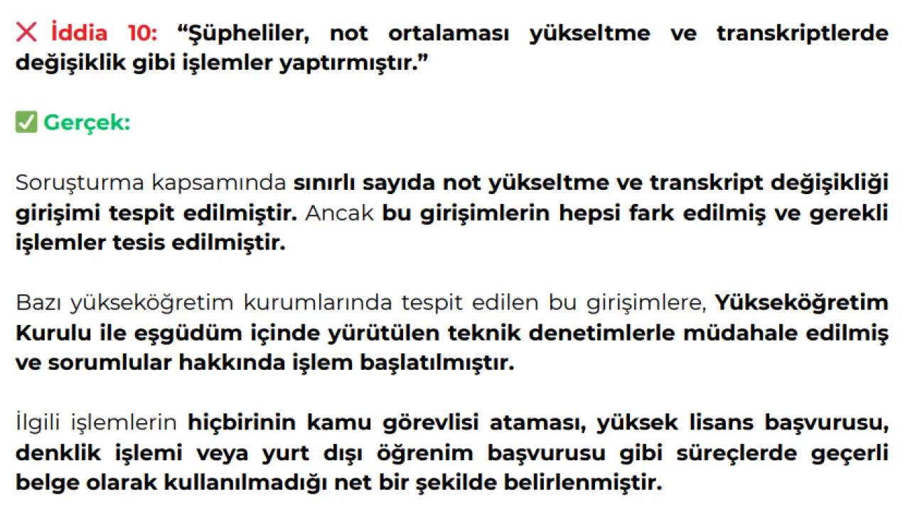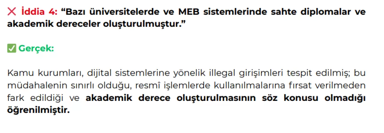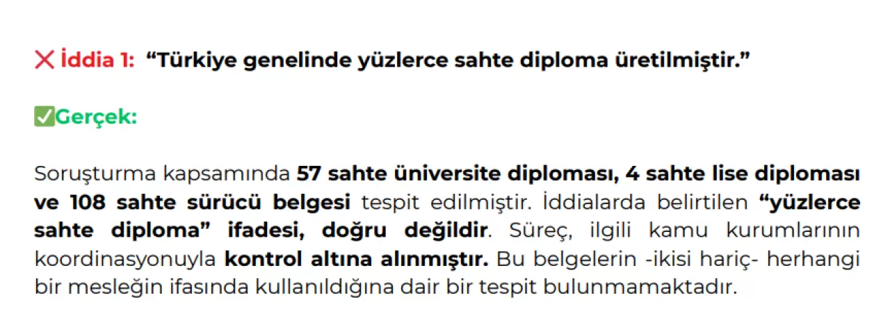 Bazı sosyal medya paylaşımlarında iddia edildiği gibi üniversite ve Milli Eğitim Bakanlığı sistemlerinde toplu sahte diploma veya akademik derece üretimi yapılmadı. Yetkililer, sınırlı düzeydeki illegal girişimlerin erken fark edilerek engellendiğini, bu belgelerin resmi işlemlerde kullanılmasına fırsat verilmediğini açıkladı.