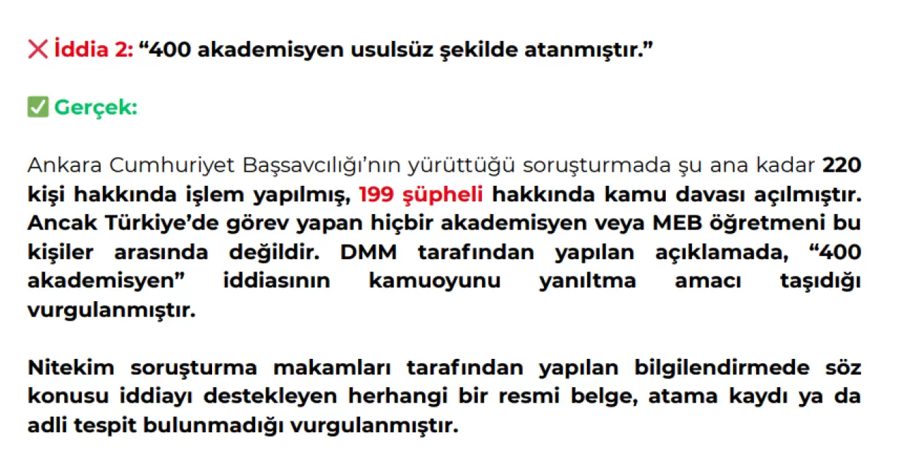 Sosyal medyada yer alan “400 akademisyen usulsüz atandı” iddiasına da net yanıt geldi. Savcılık verilerine göre şu ana kadar 220 kişi hakkında işlem yapıldı, 199 şüpheli hakkında kamu davası açıldı. Ancak bu kişiler arasında görev yapan hiçbir akademisyen ya da Milli Eğitim Bakanlığı öğretmeni bulunmuyor. İddiayı destekleyen resmi belge veya kayıt da mevcut değil.