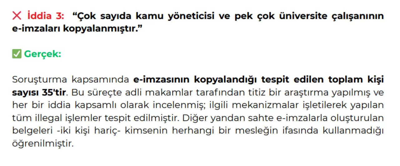 Bazı haberlerde yer alan “çok sayıda kamu yöneticisi ve üniversite çalışanının e‑imzaları kopyalandı” iddiası da gerçeği yansıtmıyor. Yapılan teknik incelemede, e‑imzası kopyalanan kişi sayısının 35 olduğu belirlendi. Üstelik bu e‑imzaların büyük kısmı herhangi bir resmi işlemde kullanılmadan tespit edilip geçersiz hale getirildi.
