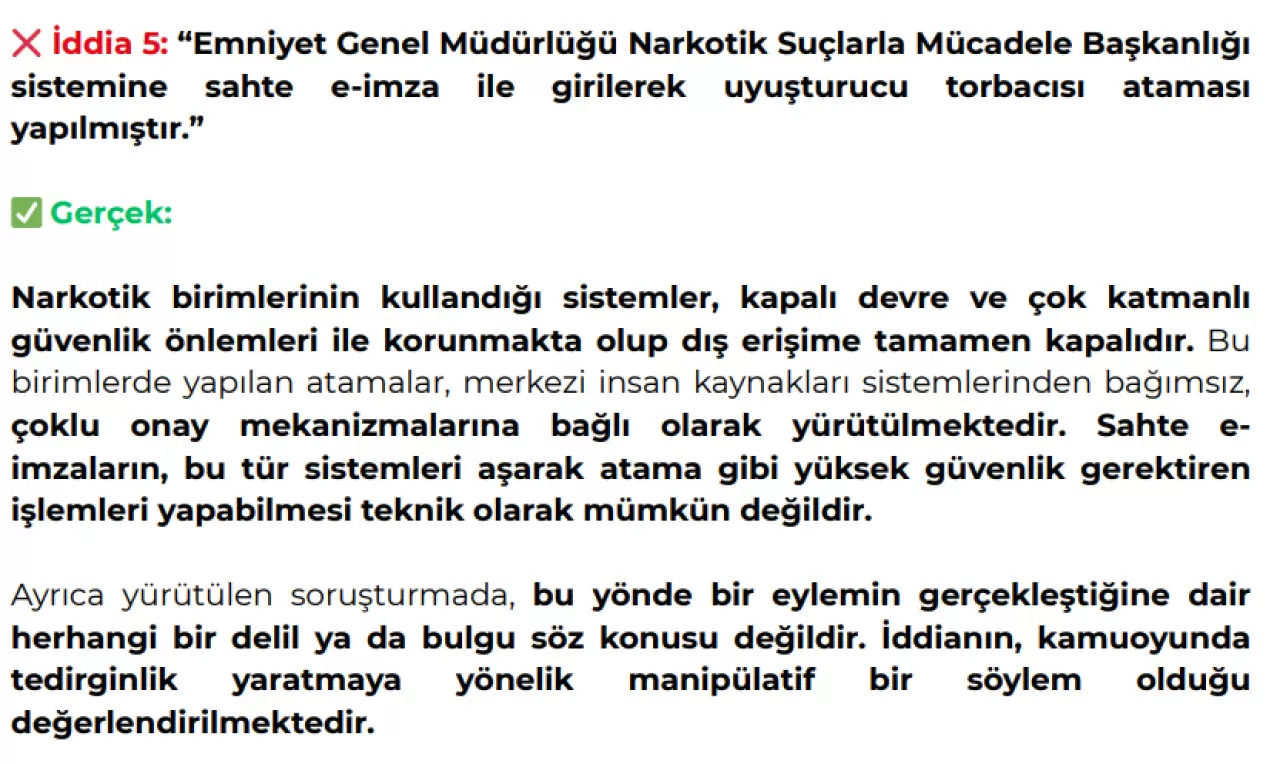 Kamuoyunda büyük yankı uyandıran “Narkotik Suçlarla Mücadele Başkanlığı sistemine sahte e‑imza ile torbacı ataması yapıldı” iddiası da yalanlandı. DMM, bu sistemlerin kapalı devre çalıştığını, dış erişime tamamen kapalı olduğunu ve çok katmanlı güvenlik önlemleri ile korunduğunu vurguladı. Bu nedenle sahte e‑imzaların bu tür sistemlerde atama yapmasının teknik olarak imkânsız olduğu belirtildi.