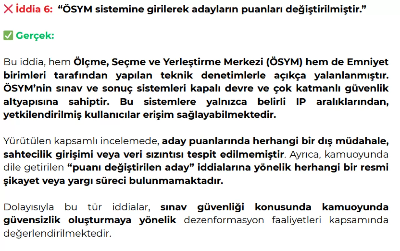 Benzer şekilde “ÖSYM sistemine girilerek aday puanları değiştirildi” iddiası da hem ÖSYM hem de emniyet birimleri tarafından yapılan teknik denetimlerle yalanlandı. Sistemin kapalı devre ve yüksek güvenlikli olduğu, yalnızca belirli IP aralıklarından yetkilendirilmiş kullanıcıların erişebildiği, herhangi bir puan değişikliği veya veri sızıntısının tespit edilmediği açıklandı.