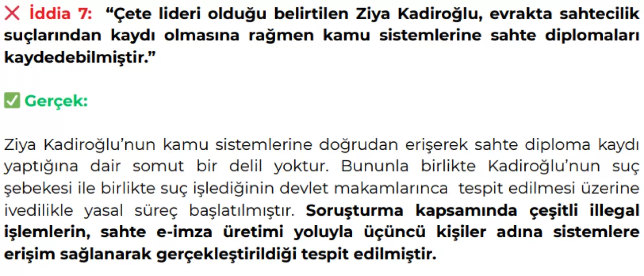 Çete lideri olduğu öne sürülen Ziya Kadiroğlu’nun kamu sistemlerine doğrudan sahte diploma kaydı yaptığına dair somut bir delil bulunmadığı açıklandı. Ancak Kadiroğlu’nun sahte e‑imza üretimi yoluyla üçüncü kişiler adına sisteme erişim sağladığı ve bu yolla çeşitli illegal işlemler yaptığı belirlendi.