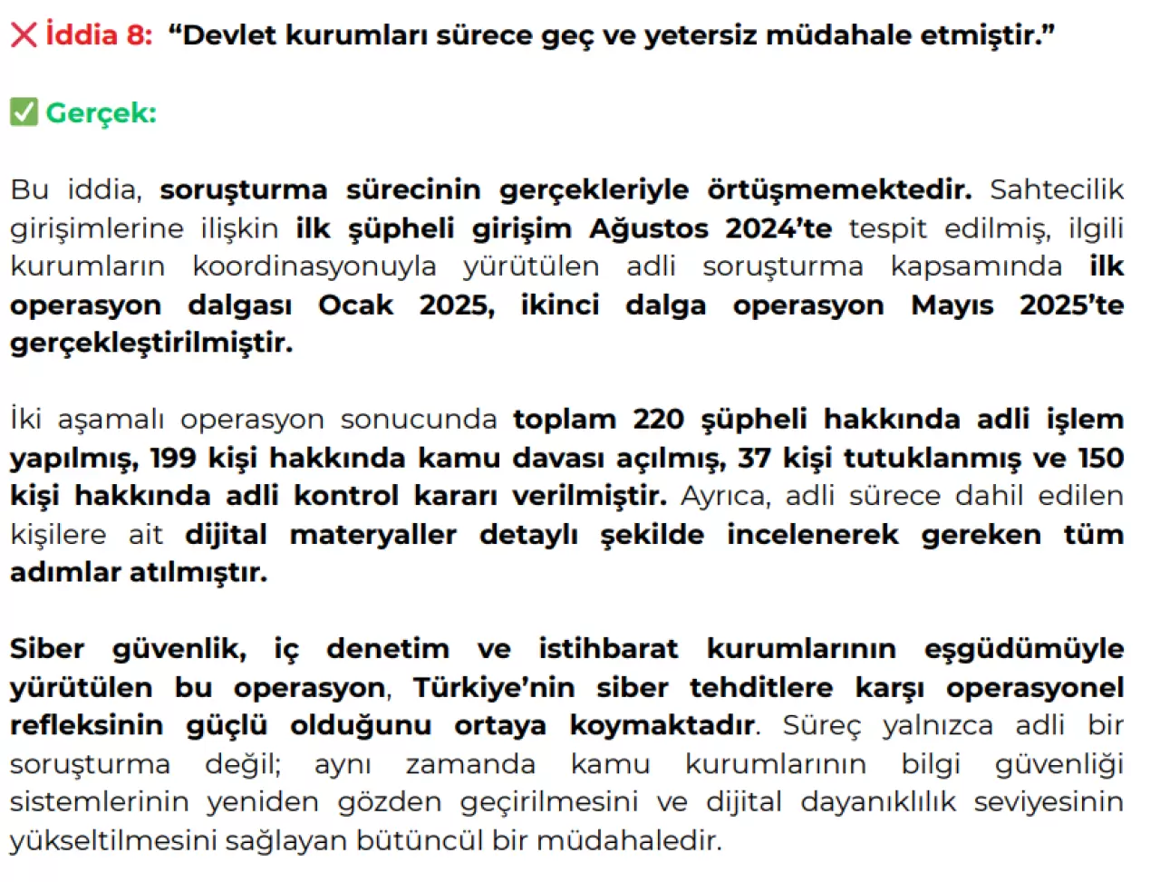 DMM, “Devlet kurumları sürece geç müdahale etti” eleştirilerini de reddetti. İlk şüpheli girişimin Ağustos 2024’te tespit edildiği, ardından Ocak 2025’te ilk operasyon dalgasının, Mayıs 2025’te ise ikinci operasyon dalgasının düzenlendiği aktarıldı.
