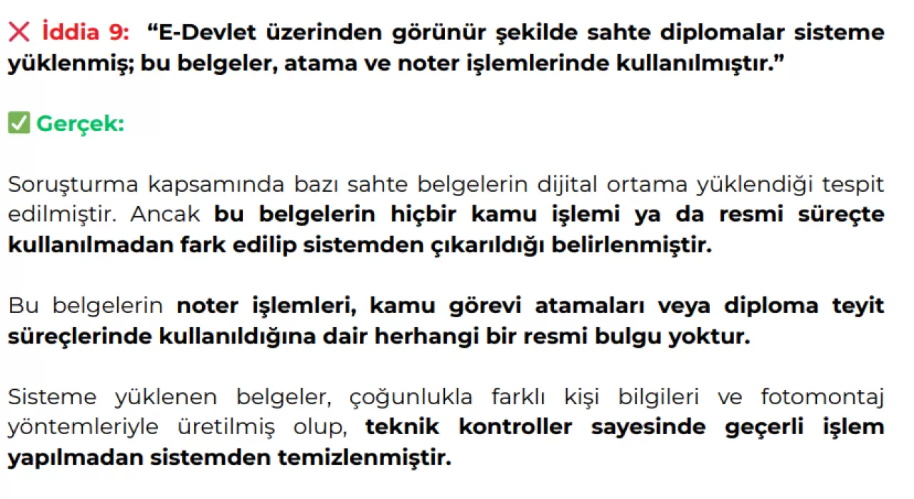 E‑Devlet üzerinden sahte diplomaların yüklenerek atama veya noter işlemlerinde kullanıldığı iddialarına da yanıt geldi. DMM, bu belgelerin kamu işlemlerinde kullanılmadan tespit edilerek sistemden çıkarıldığını, büyük bölümünün fotomontaj veya sahte bilgilerle üretildiğini açıkladı.