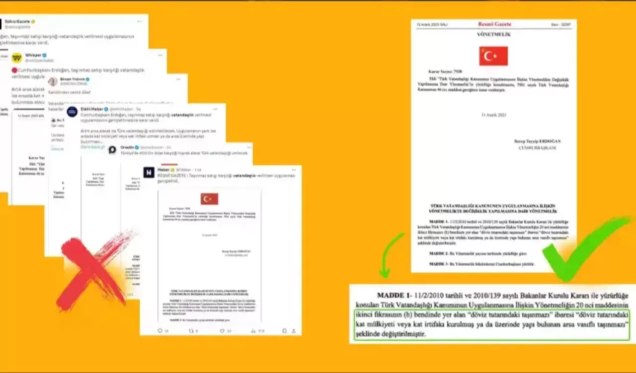 Dezenformasyonla Mücadele Merkezi(DMM) bazı sosyal medya hesaplarından yapılan asılsız iddiaları yalanladı. DMM'den yapılan açıklamada, "Bazı basın yayın organlarında yer alan, "Cumhurbaşkanı Erdoğan, taşınmaz satışı karşılığı vatandaşlık verilmesi uygulamasının genişletilmesine karar verdi." iddiası doğru değildir." denildi.