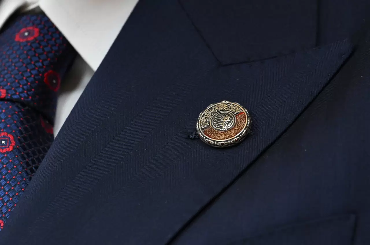 Yüzükle aynı konsept doğrultusunda hazırlanan rozet ise bu görsel şöleni tamamlayan son parça oldu. Yüzüğün ana unsurlarını koruyan rozet tasarımı, çevresini saran yakut zirkon taşlarla zenginleştirilerek bütüncül bir tasarım diliyle hazırlandı.