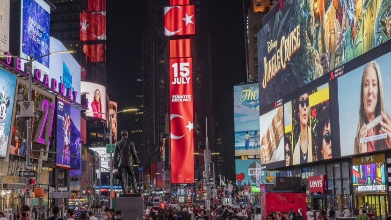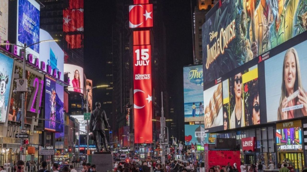 15 Temmuz başarısız darbe girişiminin 5. yıl dönümünde, Times Meydanı'ndaki dijital dev ekranda, FETÖ'nun 15 Temmuz darbe girişimine karşı Türk halkının direnci "Victory of Democracy" (Demokrasi Zaferi) ve "Türkiye Geçilmez" mesajlarıyla anlatıldı.