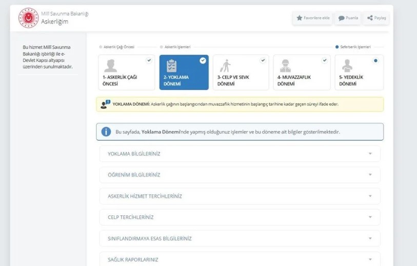 "Vatandaşlarımız e-Devlet portalında 'Askerliğim' sekmesine giriş yaptığında, ilgili bölüme otomatik olarak yönlendirilecektir. Bu kapsamda, askerlik çağı, yoklama, celp ve sevk, muvazzaflık ve yedeklik dönemlerini içeren tüm işlemlere kolaylıkla erişebilecektir. Söz konusu hizmet ile askerlik çağına gelmiş gençlerimizden terhis olmuş vatandaşlarımıza kadar tüm süreci kapsayan askerlikle ilgili iş ve işlemler dijital ortamda tek nokta üzerinden yapılabilecektir."