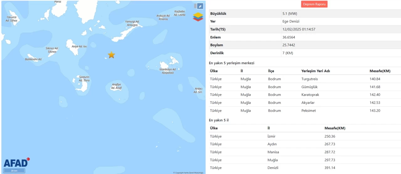 Afet ve Acil Durum Yönetimi Başkanlığı’nın (AFAD) internet sitesinde yer alan bilgilere göre, Ege Denizi’nde saat 04.14’te 5,1 büyüklüğünde bir sarsıntı meydana geldi.