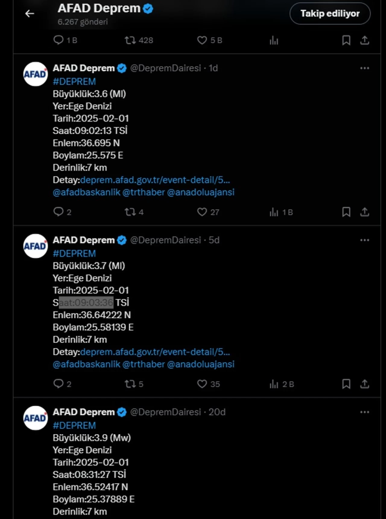 Son deprem ise 3.7 büyüklüğünde kaydedildi. Bu sarsını ise 7 km derinlikte gerçekleşti.
