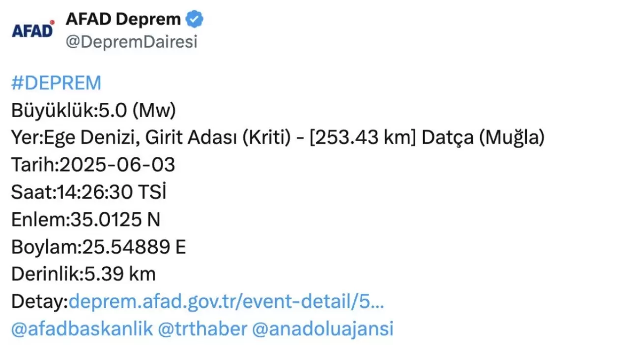 Muğla'nın Datça ilçesine 253 kilometre uzaklıkta olan depremin, 5,39 kilometre derinlikte meydana geldiği belirlendi.