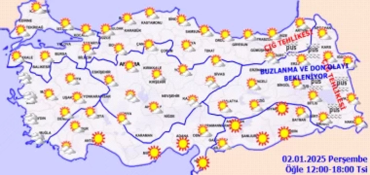 Meteoroloji Genel Müdürlüğü'nün son hava durumu tahminlerine göre, bugün yurt genelinde açık ve az bulutlu bir hava hâkim olacak. Ancak gece saatlerinden itibaren Ege kıyılarında sağanak yağış bekleniyor. Doğu Anadolu ve Doğu Karadeniz’in yüksek kesimlerinde çığ tehlikesi bulunuyor.