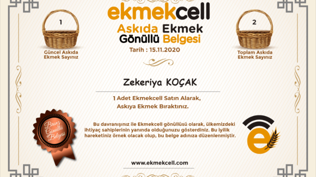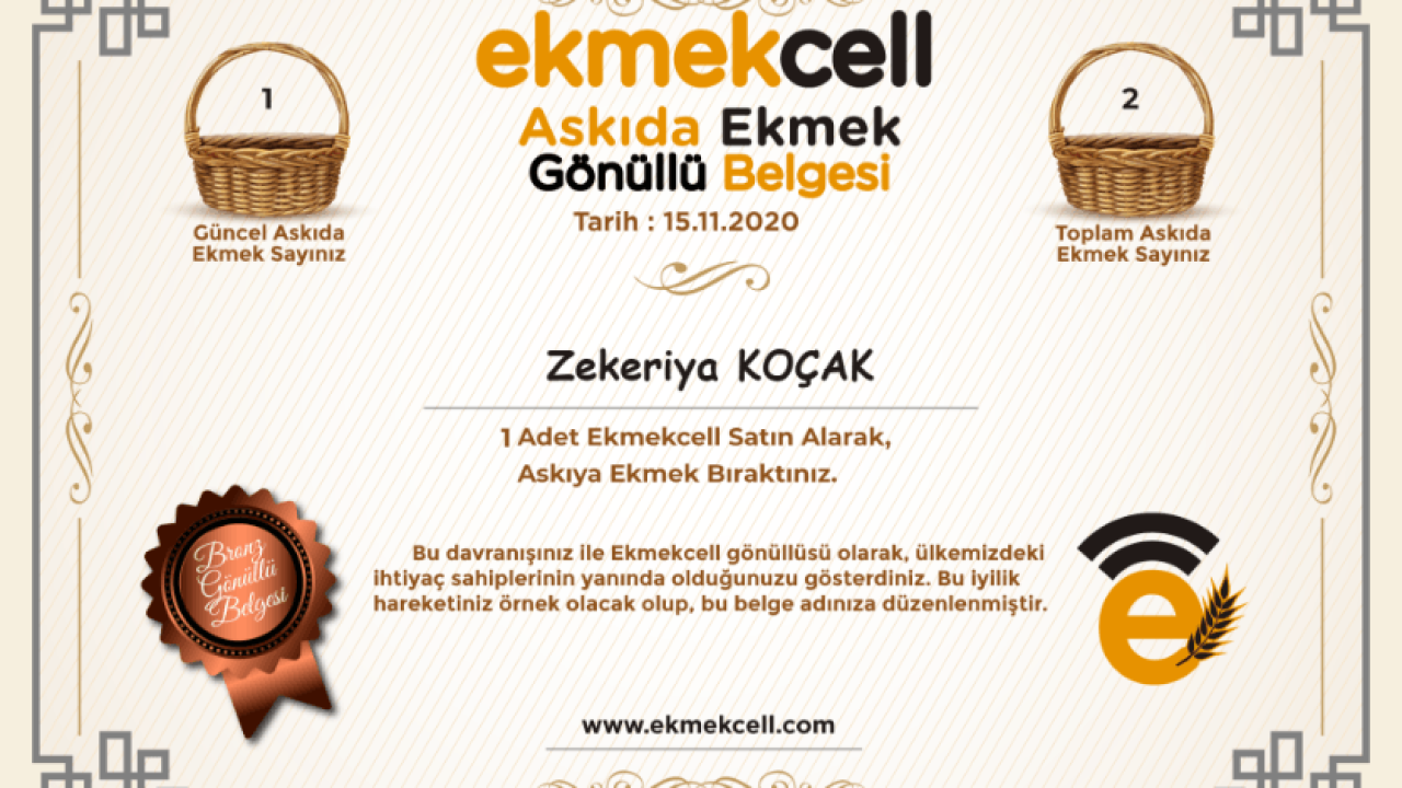 Aynı zamanda Ekmekcell’den ekmek satın alıp otomatik olarak askıya bırakılan ekmekler için, askıya bırakan her müşterimizin adına özel olarak düzenlenen Askıda Ekmek Gönüllü Belgesini, Belgelerim menüsünden indirip, kaç adet bıraktığı ve ismine düzenlenen bu belgeyi indirerek, sosyal medyada örnek teşkil etmek adına paylaşımda bulunabilir. Aynı zamanda www.ekmekcell.com’da askıya ekmek bırakan müşteri ya da firmaların kaç adet bıraktığı ve isimlerini de Askıda Ekmek Gönüllülerimiz butonundan görüntülenecektir.