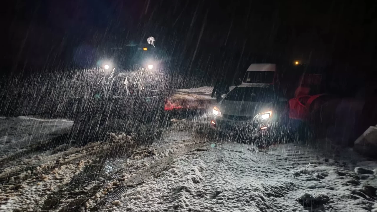 İlçede yüksek kesimlerde etkili olan kar yağışı ve tipi nedeniyle Kartaldere Grup Yolu'nda bazı araçlar yolda kaldı.