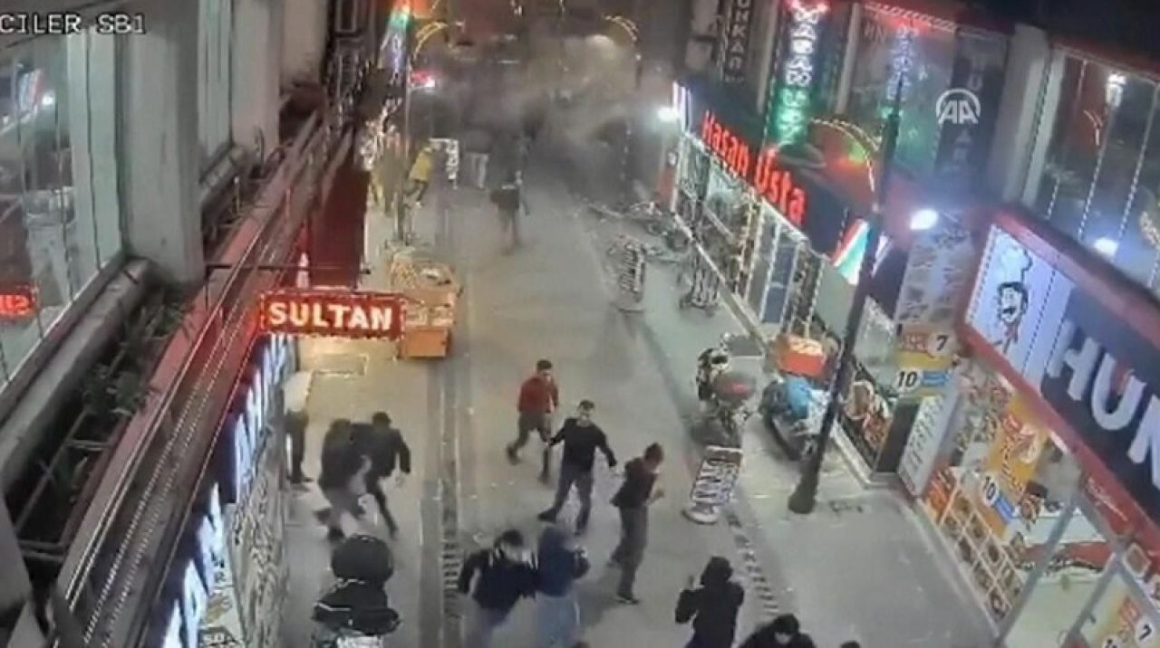 Mustafa Paşa Mahallesi'nde kaydedilen bir başka görüntüde ise yaya ve sürücülerin hissedilen sarsıntı ile büyük panik yaşadığı ve bir binanın yıkıldığı, yıkılan binanın enkazından yükselen duman ve tozun caddeyi kaplaması yer alıyor.