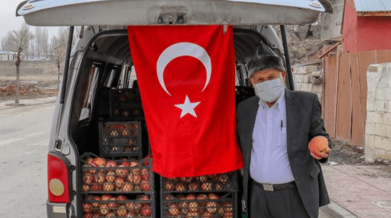AA - Bahçesinde yetiştirdiği elmaları askerlere götürmesiyle tanınan ve “Elmacı dede” olarak bilinen Muhammet Yılmaz, Türk bayraklarıyla süslediği ve üzerine "Hakkari Kıran", "Barış Pınarı Harekatı", "Hedef Kızıl Elma", "Pençe-Kaplan" yazdığı hafif ticari aracına yüklediği elmalarla yaklaşık 1614 kilometre yol kat ederek Denizli'den Van'a geldi.