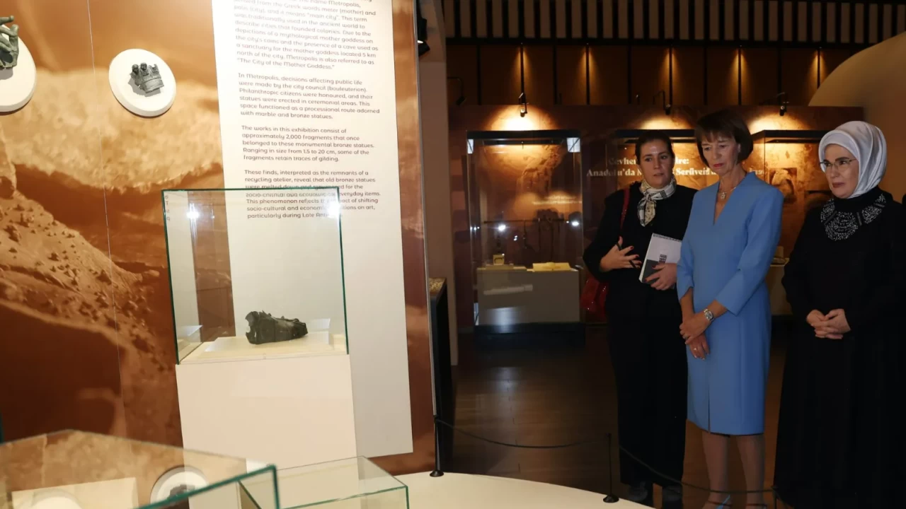 Lider eşleri daha sonra Cumhuriyet tarihinin en kapsamlı arkeoloji projesi "Geleceğe Miras" kazılarıyla bulunan eserlerin yer aldığı "Arkeolojinin Altın Çağı Sergisi"ni gezdi. Burdur'daki Boubon Antik Kenti'nde 1960'lı yıllarda yapılan kaçak kazılar sonucu yurt dışına çıkarılan ve 65 yıl aradan sonra Türkiye'ye getirilen, MS 2. ve 3. yüzyıllara tarihlenen Roma İmparatoru Marcus Aurelius bronz heykelin de yer aldığı sergiyi ilgiyle gezen Emine Erdoğan ve Charlotte Merz, eserler hakkında bilgi aldı. Lider eşleri, kütüphane ziyaretinin ardından Devlet Konukevi'ne geçerek burada ikili görüşme gerçekleştirdi.