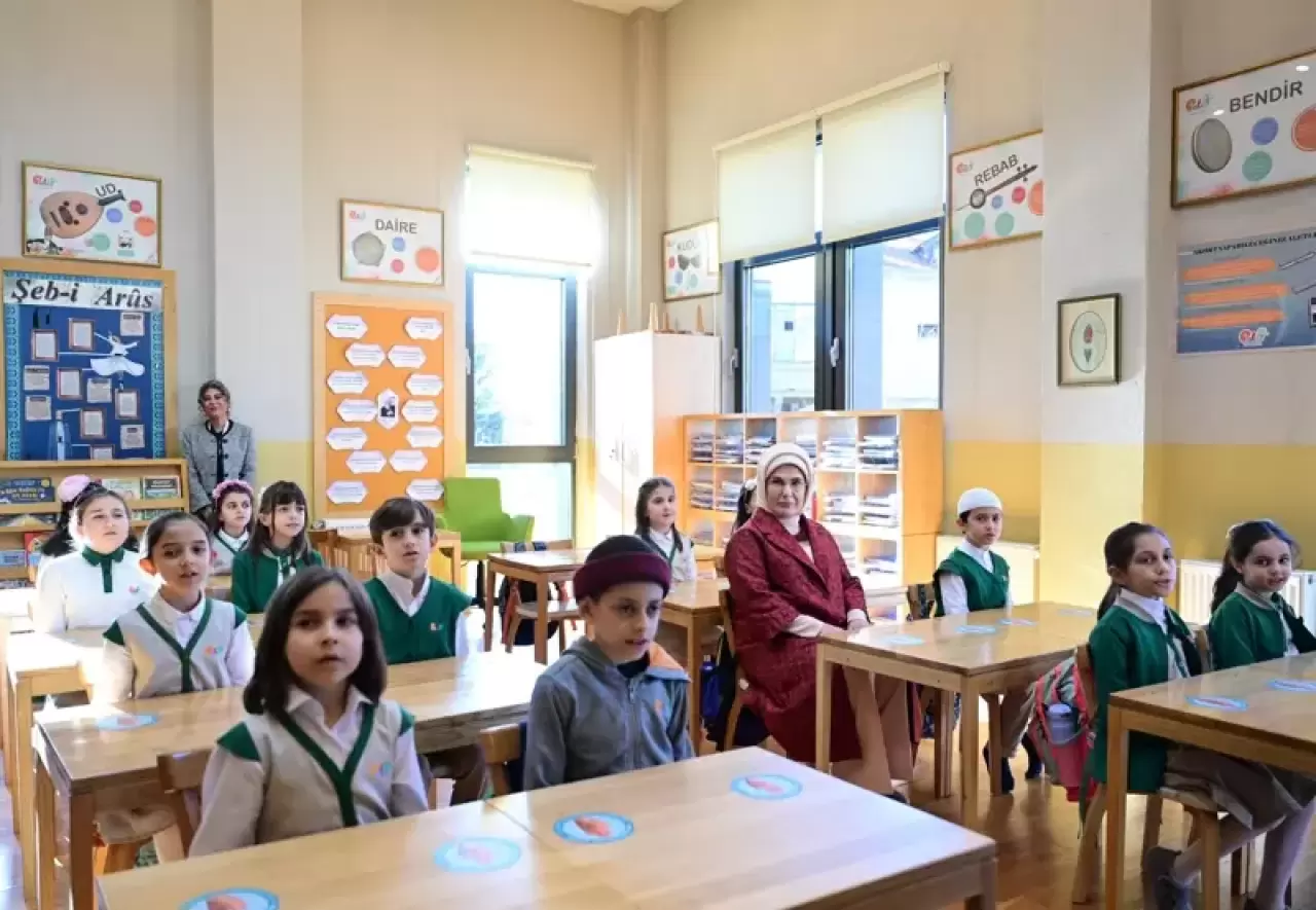Okulu ziyaretinde Bilal Erdoğan ve Yüce Gümüş tarafından karşılanan Emine Erdoğan, 3. sınıf öğrencilerinin eğitim gördüğü sınıfa girerek Kur'an-ı Kerim dersine konuk oldu. Öğrenciler bu sırada hep bir ağızdan Rahman Suresi'ni okudu.