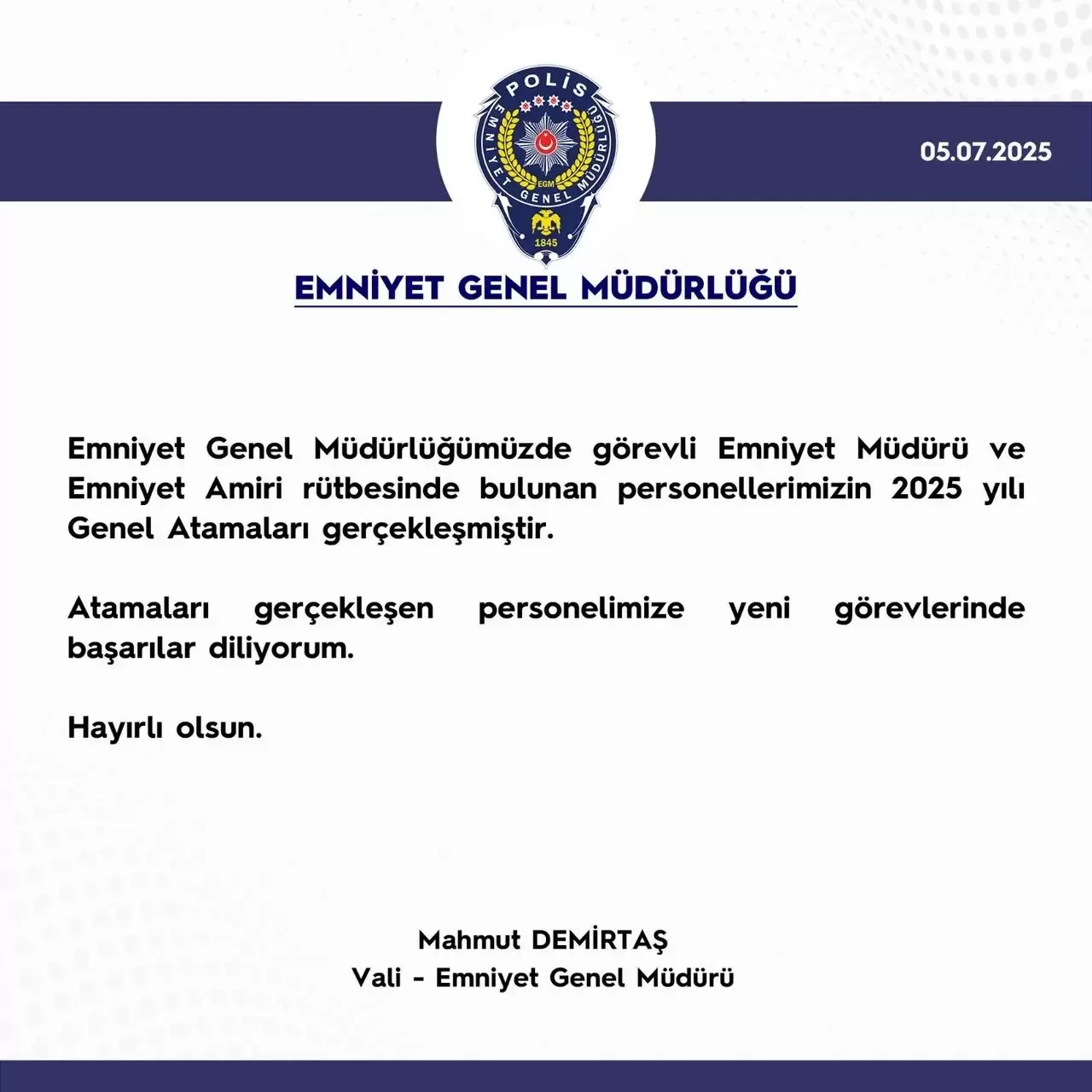 Emniyet Genel Müdürlüğü 2025 yılı kapsamında Emniyet Müdürü ve Emniyet Amiri atamalarının yapıldığını duyurdu.