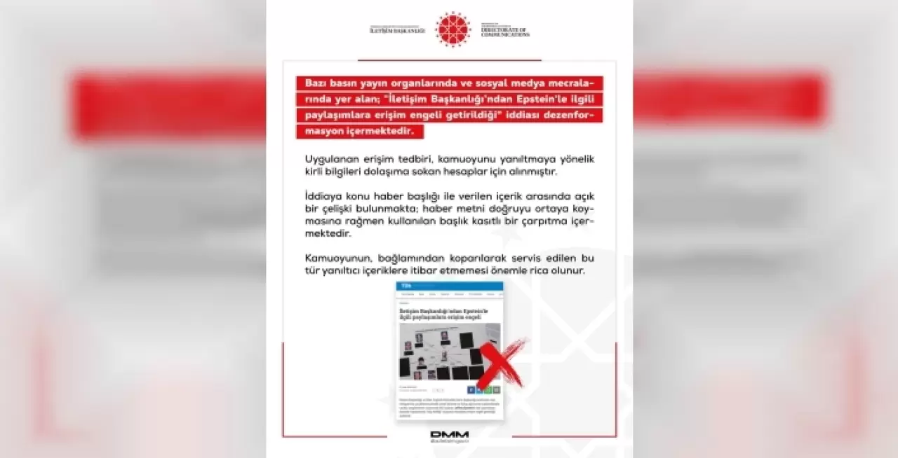 Epstein paylaşımlarına erişim engeli getirilmedi. İletişim Başkanlığı Dezenformasyonla Mücadele Merkezi (DMM), "İletişim Başkanlığından Epstein'le ilgili paylaşımlara erişim engeli getirildiği" iddiasını yalanladı.