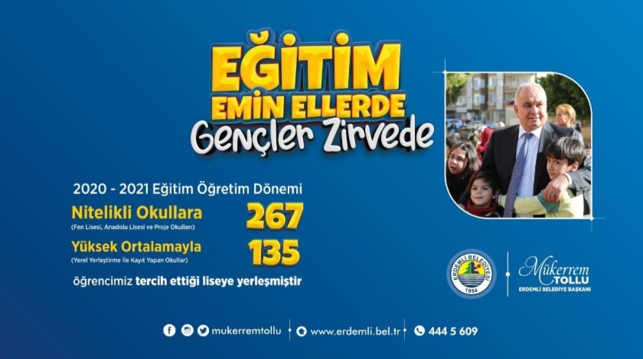 400’ü Ortaokul, 600’ü lise olmak üzere toplamda 1000 öğrenciye Erdemli Belediyesi Kurs Merkezleri’nde ücretsiz eğitim veren Erdemli Belediyesi 4 yıl önce çıktığı yolda emin adımlarla ilerliyor. 2021 Yılında Liselere Giriş Sınavı’nda 400 öğrenciden 268’i Fen Lisesi ve düzeyinde başaralı okullara yerleşerek kitlesel başarıda Türkiye’de en iyiler arasına girdi.