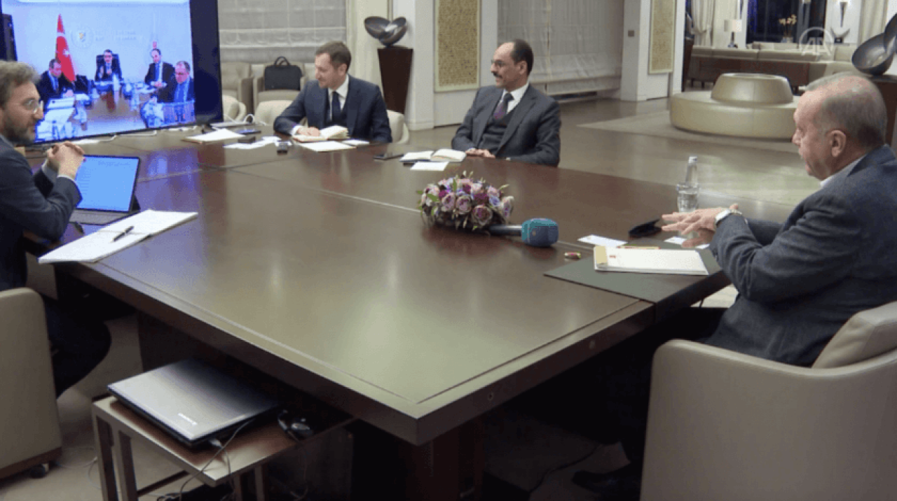 Cumhurbaşkanı Erdoğan, Cumhurbaşkanlığı Kabine üyeleriyle video konferans yöntemiyle görüşme gerçekleştirdi. Toplantıda koronavirüs salgınına karşı alınan tedbirler görüşüldü. Erdoğan'a İletişim Başkanı Fahrettin Altun ve Cumhurbaşkanlığı sözcüsü İbrahim Kalın da eşlik etti. Görüntülerde oturma düzenindeki mesafe dikkat çekti.