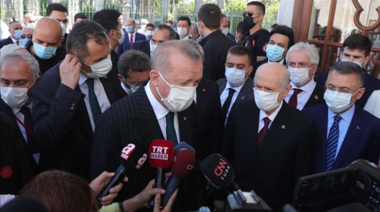 MHP Genel Başkanı Devlet Bahçeli ile aynı araçla gelerek, ziyaret ettiği türbenin girişinde basın mensuplarının sorularını yanıtlayan Erdoğan, 86 yıllık bir süreç sonunda, Cumhur İttifakı olarak MHP Genel Başkanı Devlet Bahçeli ile gayretleri neticesinde, yargının artık hakikatle görmesiyle Ayasofya-i Kebir Camii'nin aslına döndüğünü söyledi.