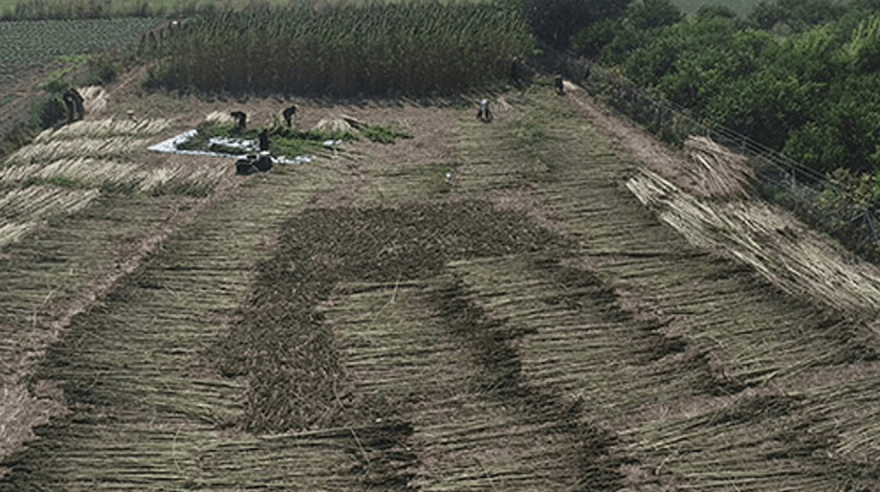 Oğrak'ın 3 dönümlük arazisinde hasadı yapılan endüstriyel kenevirler, havadan görüntülendi.