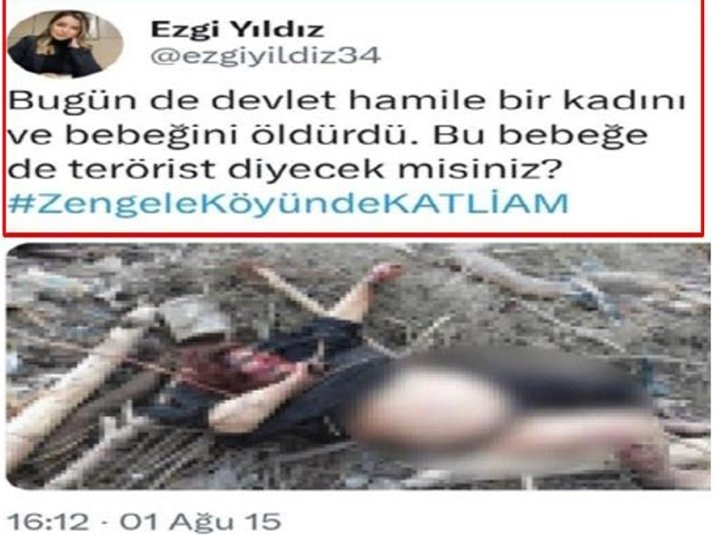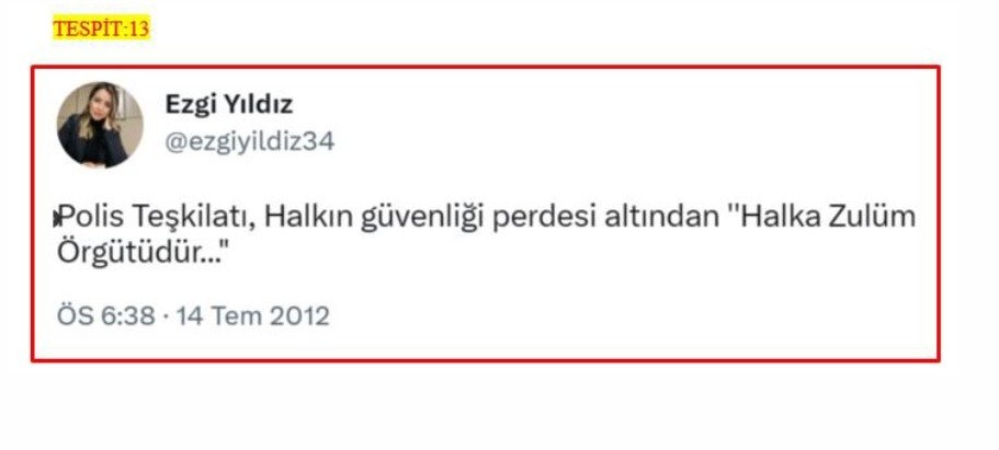 PKK'lı teröristlerin Güneydoğu'da başlattıkları Hendek Olayları'nı sonlandırmak amacıyla aylarca nokta operasyonlarıyla ilerleyen Türk Silahlı Kuvvetleri'ne 'katliam' iftirasına da destek çıkan Yıldız'ın emniyet teşkilatını karalayan paylaşımları da ortaya çıktı. Yıldız'ın "Polis Teşkilatı, halkın güvenliği perdesi altından 'Halka zulüm örgütüdür" paylaşımıyla emniyet teşkilatını hedef aldığı saptandı. Yıldız'ın ayrıca devleti teröristlikle suçlayan paylaşımlarda da bulunduğu belirlendi.