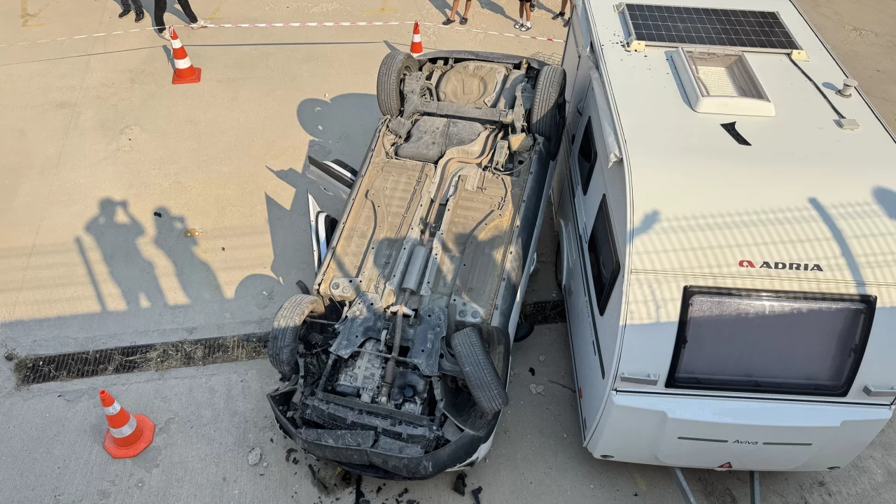 Devrilen otomobil, bahçede park halindeki bir karavana çarptı.