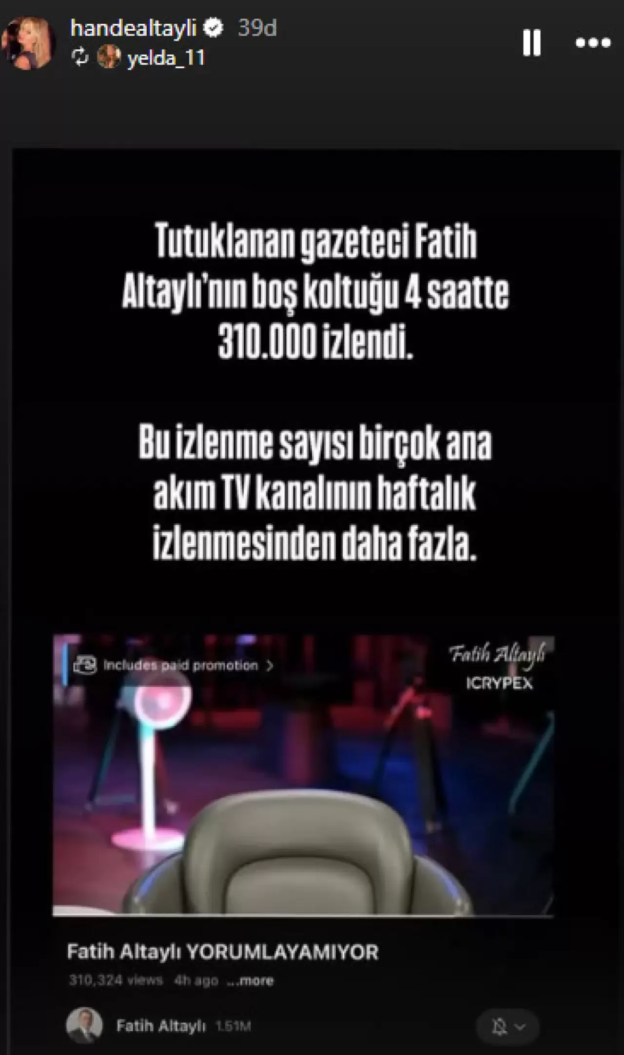 Konu Altaylı'nın eşinin de gündemindeydi. Instagram hesabından bir paylaşım yapan Hande Altaylı, eşinin boş koltuğunu izleyen 310 bin kişi ile övündü.